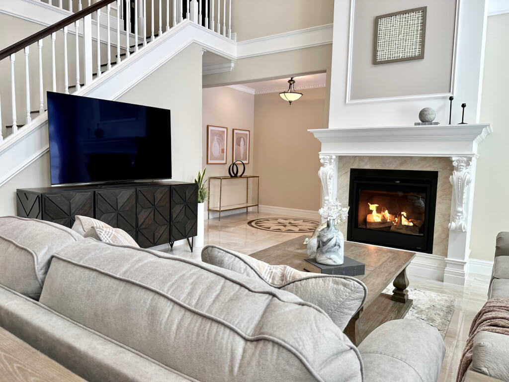 クラシカルな雰囲気のモールディングや柱、暖炉など、細部までこだわりが感じられる美しい内装に、クラシックの王道、ロールアームが優雅な“Olsberg(オルスバーグ)”がマッチしています。グレーや赤みを抑えたブラウンの家具の組合わせは、上品で軽やかなクラシカルな印象を与えます。