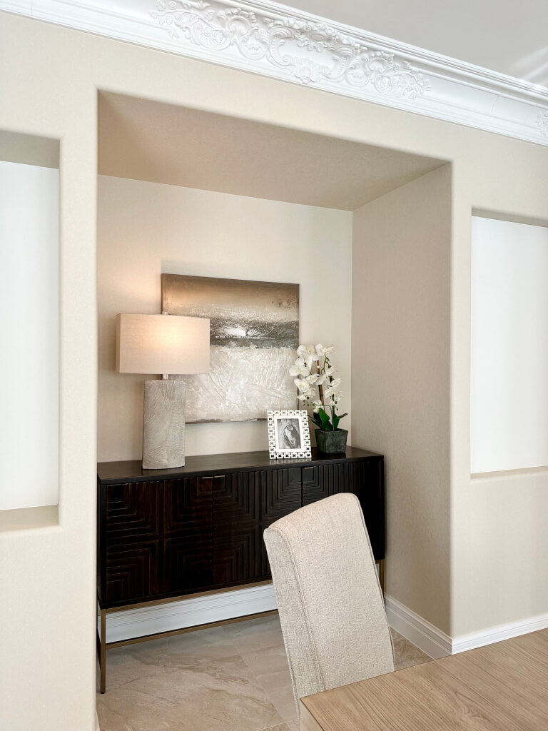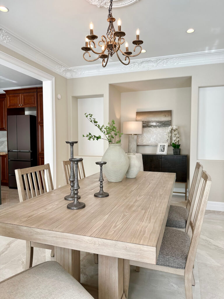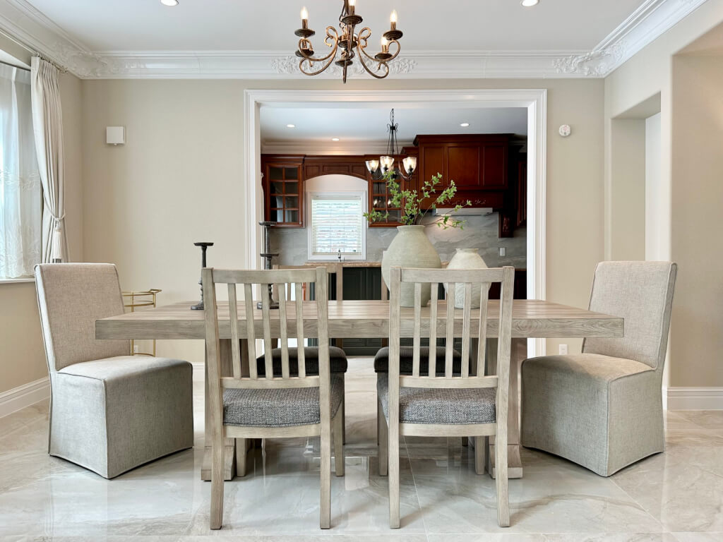 ダイニングルームはモダンテイストのダイニングテーブルとサイドボードをミックスさせた折衷スタイル。相反する要素の融合により、普遍の美しさが宿った空間に仕上がっています。